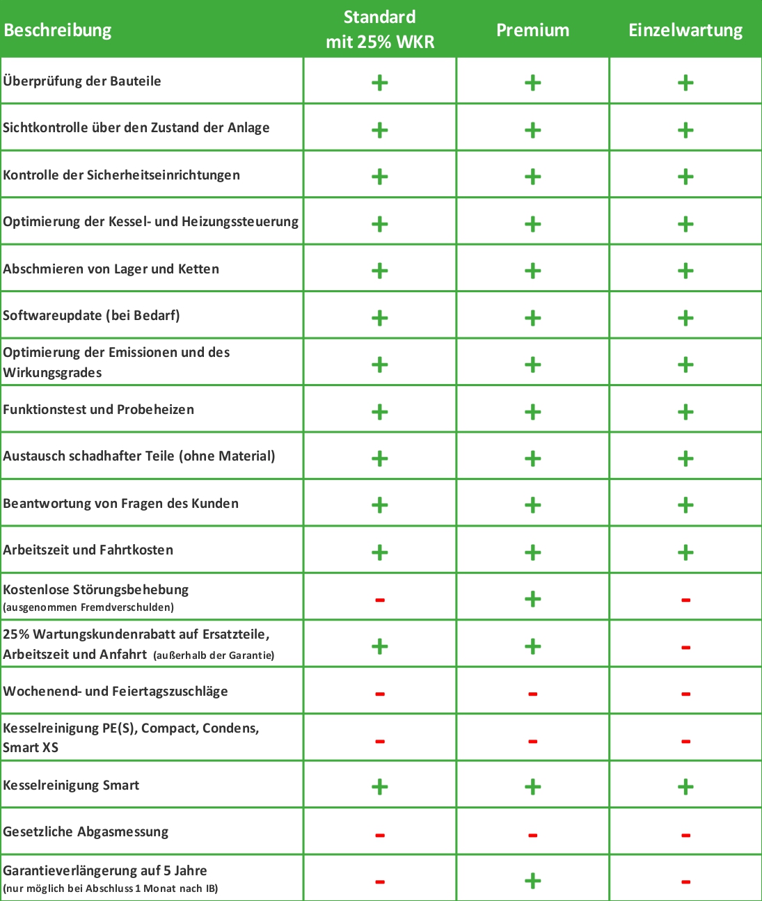 - Premium-Wartungsvertrag mit jährlicher Wartung und kostenloser Störungsbehebung sowie Garantieverlängerung auf 5 Jahre. Garantieverlängerung nur bei Abschluss des Wartungsvertrages innerhalb 1 Monates nach Inbetriebnahme. Bei späterem Abschluss oder nach 5 Jahren nur noch kostenlose Störungsbehebung und 25% Wartungsvertragsrabatt auf Ersatzteile.